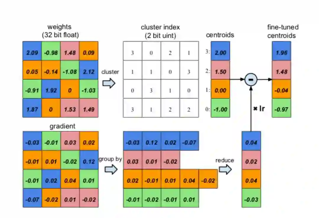 为了进一步压缩模型大小,对于剪枝后稀疏的神经元,通过量化编码,将连续的权值离散化,从而用更少比特数来存储浮点权值,如图 8 所示。最后再通过霍夫曼编码进一步压缩模型大小,最终可以在不损失精度的情况下将模型大小压缩 35 到 49 倍。