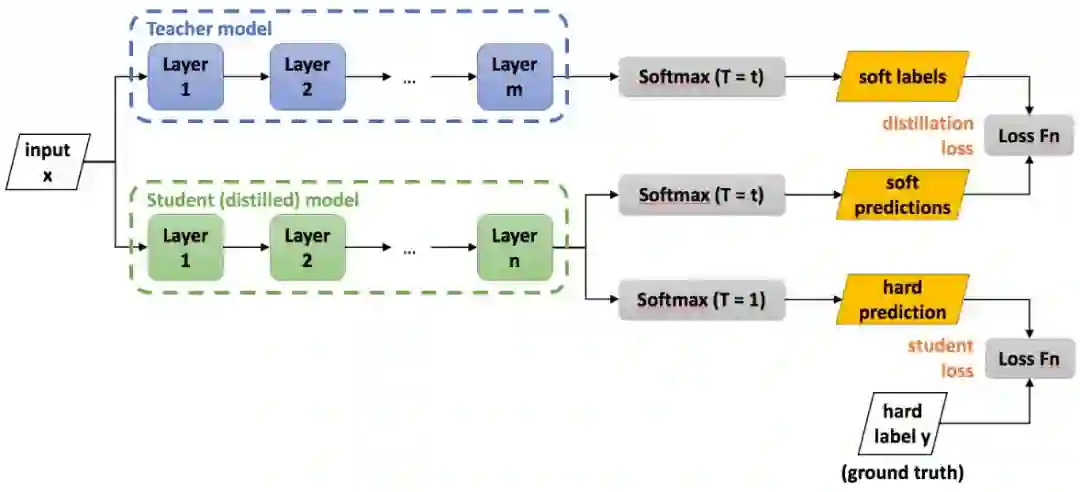 使用大模型产生 soft target 代替 hard target 能获得更多的信息和更小的梯度方差,可以达到更好的性能。一般模型蒸馏的流程如下,先训好一个大模型,让后让小模型去拟合大模型产生的 soft target,在蒸馏结束后,一般还会使用真实的 label 信息进行 fine-tuning,如图 12 所示。