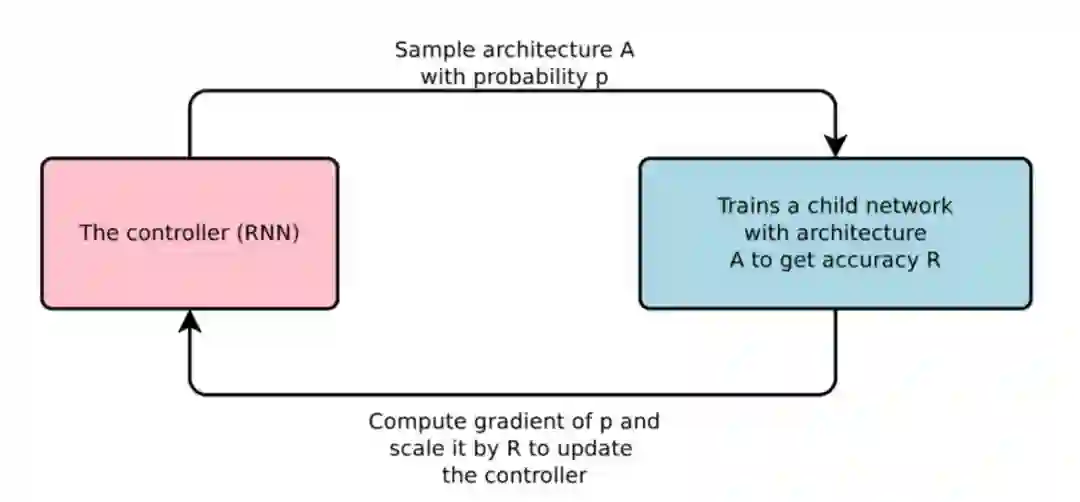 论文「NEURAL ARCHITECTURE SEARCH WITH REINFORCEMENT LEARNING」将架构的生成看成是一个 agent 在选择 action,reward 是通过在训练集上训练一定的 epochs 后的精度。在具体的实现过程中,用 RNN 作为控制器来表示策略函数,每次通过 RNN 生成一串编码,通过一个映射函数将编码映射成网络结构,并使用 policy gradient 来优化 RNN 控制器的参数,如图 1 所示。