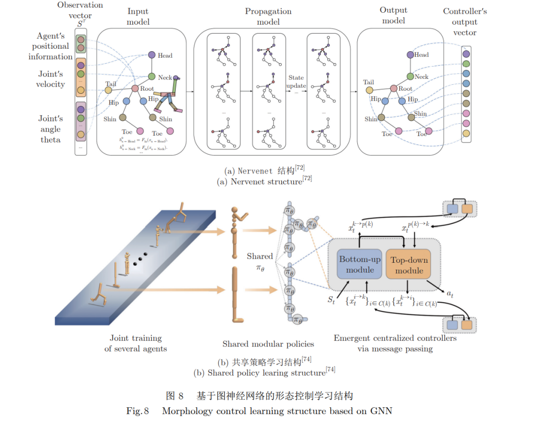 整体上, 利用图神经网络的基本出发点是智能体的形态可以产生对控制器学习有益的归纳偏置(Inductive bias). 但是, 目前能处理的智能体自由度、类型仍然较少, 在适应显著差异的形态之间的高效迁移方面还需深入研究.