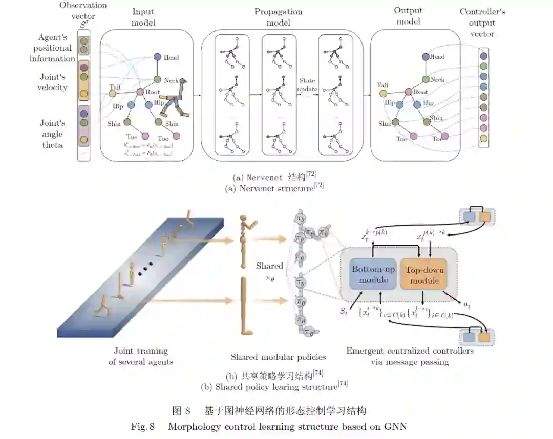 在强化学习领域有不少将图结构引入提升学习效率的工作, 但大都限于用图结构来描述智能体所处的环境, 而不是智能体的形态本身[69-70]. 事实上, 很多机器人, 甚至动物的身体形态都可以描述为离散图结构G=(V,E) . 其中图的节点v∈V 可以表示智能体的关节, 而边e∈E 则可以代表关节之间的依赖关系(可以是物理的, 也可以是非物理的). 描述这种关系的有力工具就是图神经网络(Graph neural network, GNN)[71]. 在图神经网络中, 每个结点利用自身历史状态和接受到其他节点的消息来更新自身的状态, 因而可以利用类似分布式计算架构中的同步消息传递机制来实现前向推理, 在处理不同形态(对应不同的状态维数和动作空间维数)方面具有很大的优势, 这一特点吸引了很多学者的关注. 文献[72]提出了一种名为NerveNet的模型来将智能体的形态结构信息融入控制器学习中(见图8(a)). NerveNet中的每个节点都从观测向量中获取自己需要的输入信息, 然后通过对其进行处理后作为消息传递给邻域节点, 并更新每个节点的隐藏状态. 假设第k 个执行机构对应的策略为πθ,k(akt∣st) , 则所有节点的输出模型组合产生了控制策略: