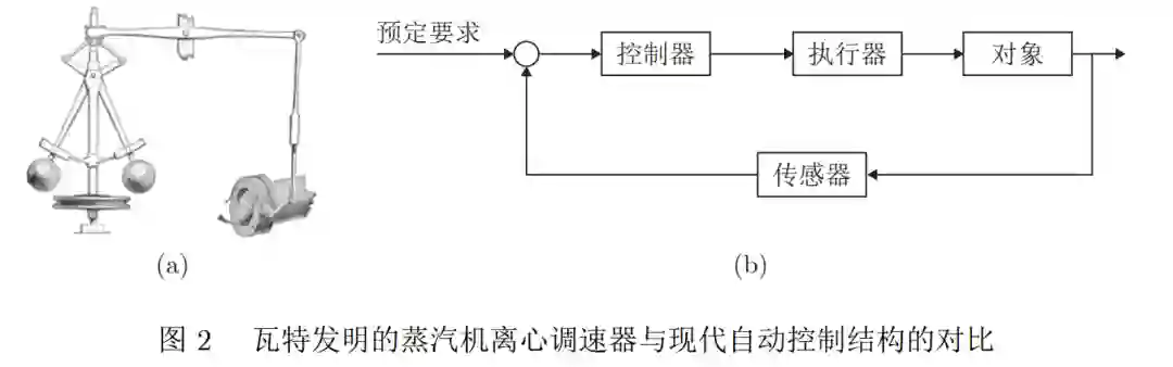 利用形态计算实现自动控制的历史可以追溯到瓦特发明的蒸汽机离心调速器, 这也是历史上公认的第一台面向实际工业应用的控制器(见图2). 离心调速器的发明使得蒸汽机走向了大规模应用, 并助力了第一次工业革命. 瓦特甚至被称为“蒸汽机之父”. 从行为控制的观点看, 离心调速器实际上是利用机构系统实现了反馈控制的模拟运算, 但这种控制结构与现代控制系统的“控制器−传感器”的反馈控制结构却有很大差别. 通过分析离心调速器的结构, 可以发现其形态中蕴含着丰富的计算与表示, 其核心与传统人工智能领域并不矛盾, 只不过是利用形态来实现计算与表示. 然而, 随着数字计算设备的迅速发展, 计算机逐渐用于实现复杂的控制器运算, 使得这种利用机构形态实现行为控制的方法在自动控制领域被极大地忽视.