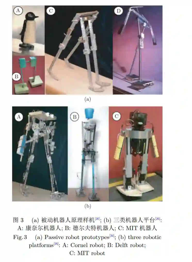 利用形态计算实现复杂行为控制的典型例子当属上世纪九十年代的被动行走机器人(Passive walking robot). 文献[25]利用这种机构的运动特性分析人类的行走机理, 阐释了利用无源动力学实现这种机构的基本原理, 并证明它可以无动力地在轻微的斜坡上实现稳定的步态. 2005年, 美国密歇根大学、康奈尔大学、麻省理工学院与荷兰德尔夫特大学的四位学者联名在Science上撰文[26], 指出通过引入微弱的动力源(用于补偿重力), 被动行走机器人可以在平面上实现类似人类一样的自然步态(见图3(a)). 他们构造了三类机器人平台, 其行走能力完全通过机器人身体与环境(重力与斜坡)之间的交互产生(见图3(b)). 这一工作摈弃了传统动力学建模与控制领域对机器人关节控制的严格要求, 使机器人完全依靠自身形态即可实现对整体行为的控制, 成为利用形态计算能力实现复杂行为智能的佐证.