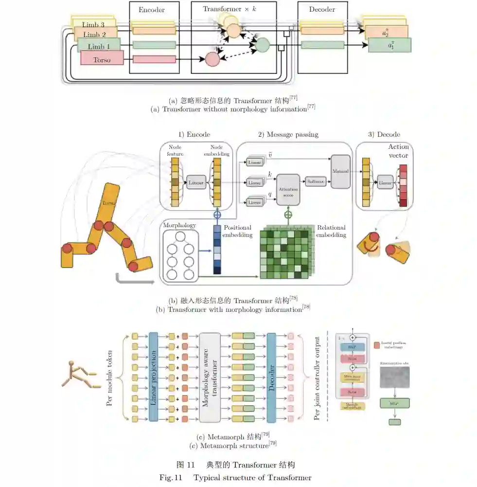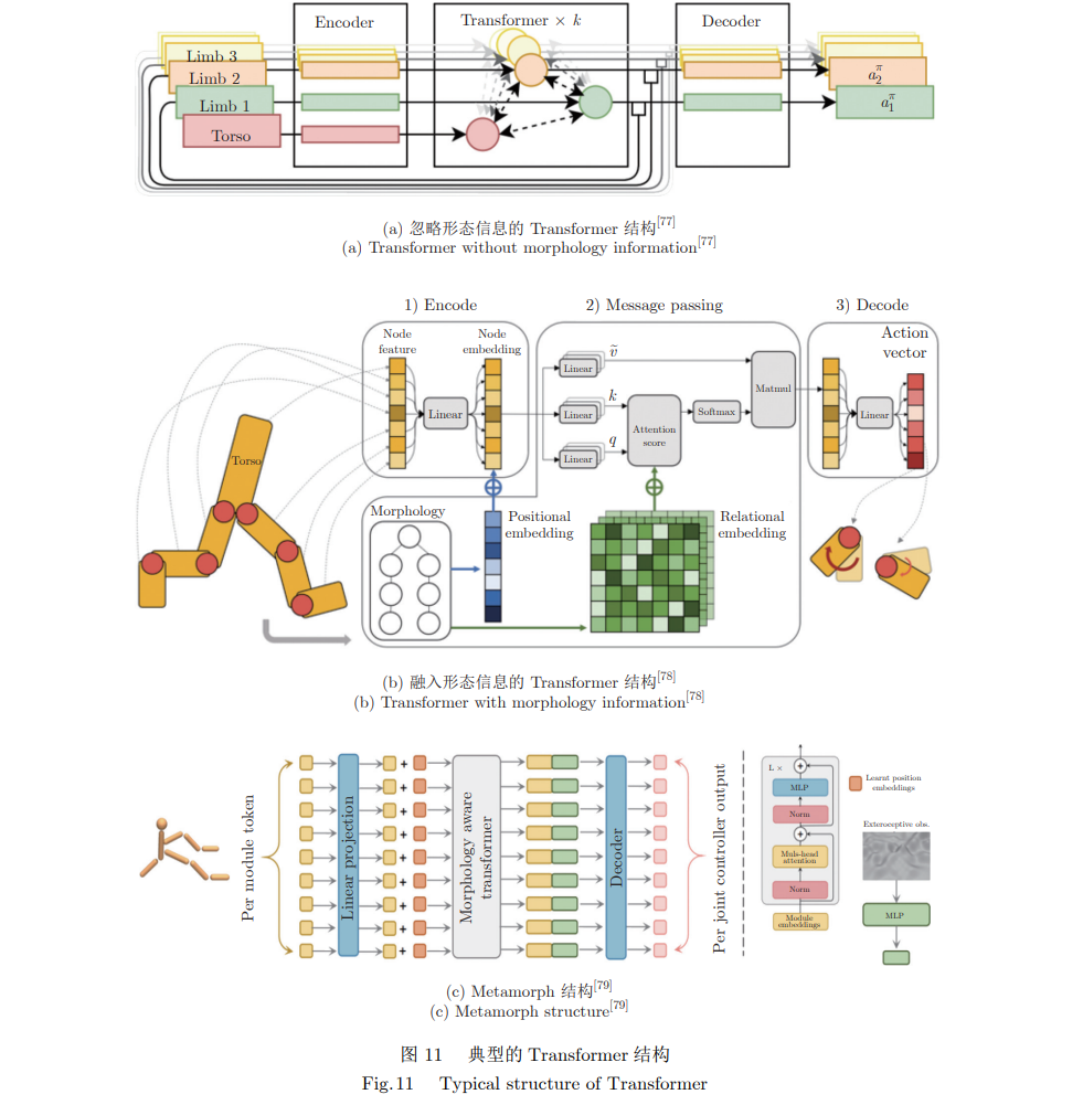 尽管图结构在形态控制中发挥了重要作用, 但由于具身智能体的形态一般都是稀疏图结构, 在多轮消息传递中很多关键信息容易被淹没, 即导致“过平滑”(Over-smoothing)问题. 近年来, Transformer作为一种基于自注意力机制的模型得到了高度关注[76]. 如果将注意力设计为边缘到顶点的集结算子, 则Transformer就可以看成全连接图上的图神经网络. 因此, 文献[77]直接利用Transformer来实现不同部件之间的消息传递(见图11(a)中的虚线箭头), 而编码器与解码器则可分离作用于不同的部件. 尽管这一方法充分体现了Transformer的潜力, 但其忽略了机器人的真实物理形态的影响. 文献[78]进一步揭示了智能体节点的位置信息对于自注意力机制的作用, 将形态(主要是position)信息嵌入Transformer模型(见图11(b)), 用于异构形态的联合策略学习, 克服了常规图神经网络中稀疏结构造成的过平滑问题.