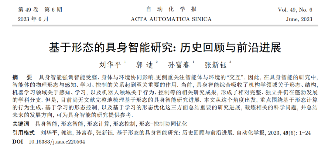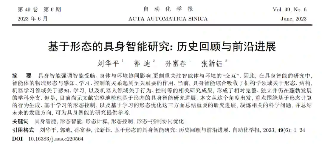 具身智能强调智能受脑、身体与环境协同影响,更侧重关注智能体与环境的“交互”. 因此, 在具身智能的研究中, 智能体的物理形态与感知、学习、控制的关系起到至关重要的作用. 当前, 具身智能综合吸收了机构学领域关于形态、结构, 机器学习领域关于感知、学习, 以及机器人领域关于行为、控制等的相关研究成果, 形成了相对完整、独立并仍在蓬勃发展 的学科分支. 但是, 目前尚无文献完整地梳理基于形态的具身智能研究进展. 本文从这个角度出发, 重点围绕基于形态计算 的行为生成、基于学习的形态控制, 以及基于学习的形态优化这三方面总结重要的研究进展, 凝炼相关的科学问题, 并总结 未来的发展方向, 可为具身智能的研究提供参考.