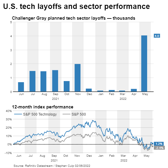 分散组织的做法也引发了人们对 Meta AI 研究未来,甚至整个 AI 领域的担忧。据路透社报道,由于通胀和消费需求减少等因素的影响,今年 5 月美国科技行业的裁员人数超过了今年前四个月的九倍,达到 4044 人。这是自 2020 年 12 月以来的最高月度总数。
