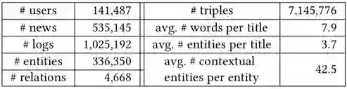 数据特征:实验中给出了新闻数据中新闻标题所含的词语数量平均值、新闻标题中包含的实体数量平均值、添加上下文实体后得到的实体数量平均值等,表明了加入知识图谱中的相邻实体确实能够丰富新闻的特征,具体如下表所示。