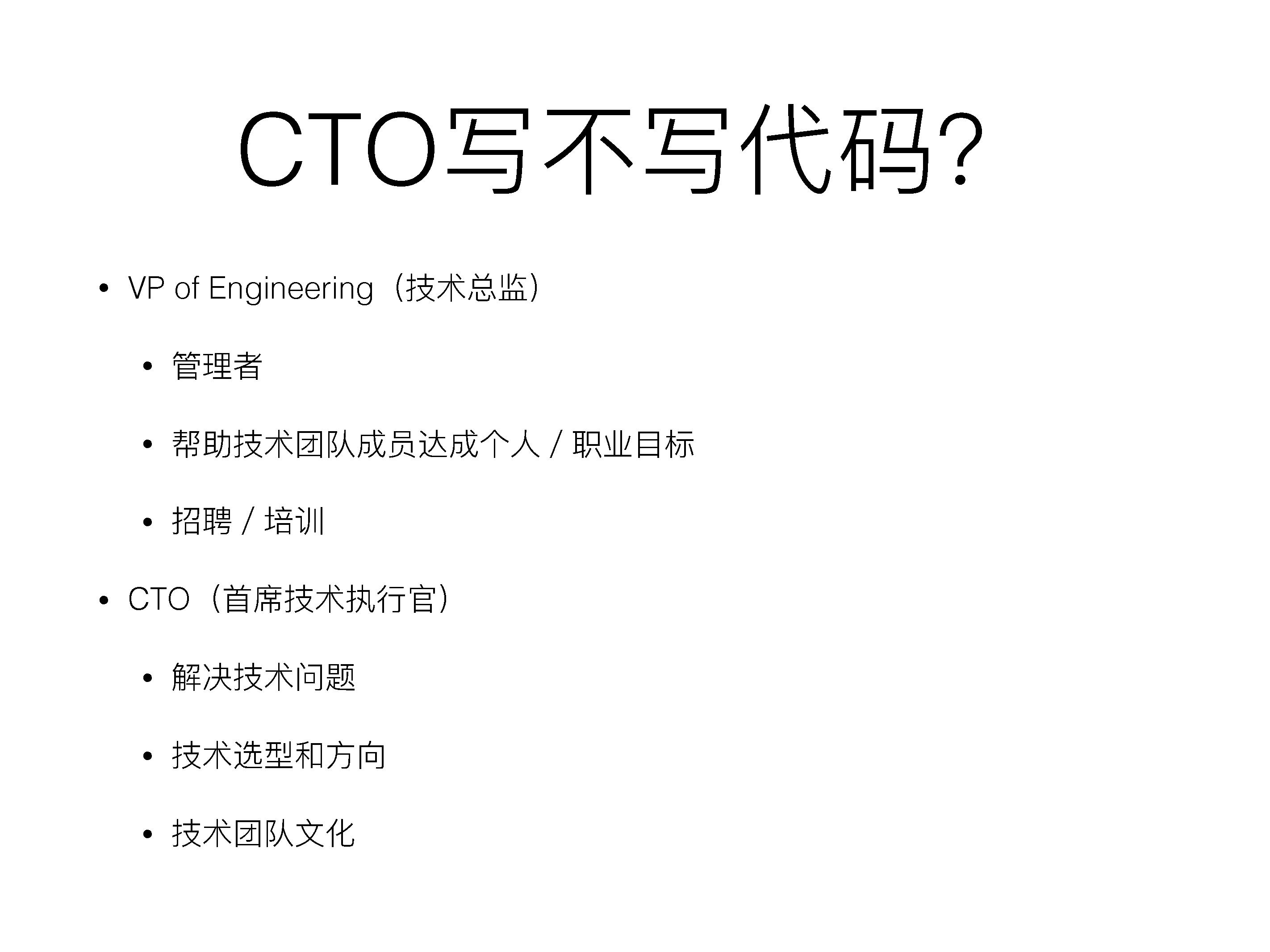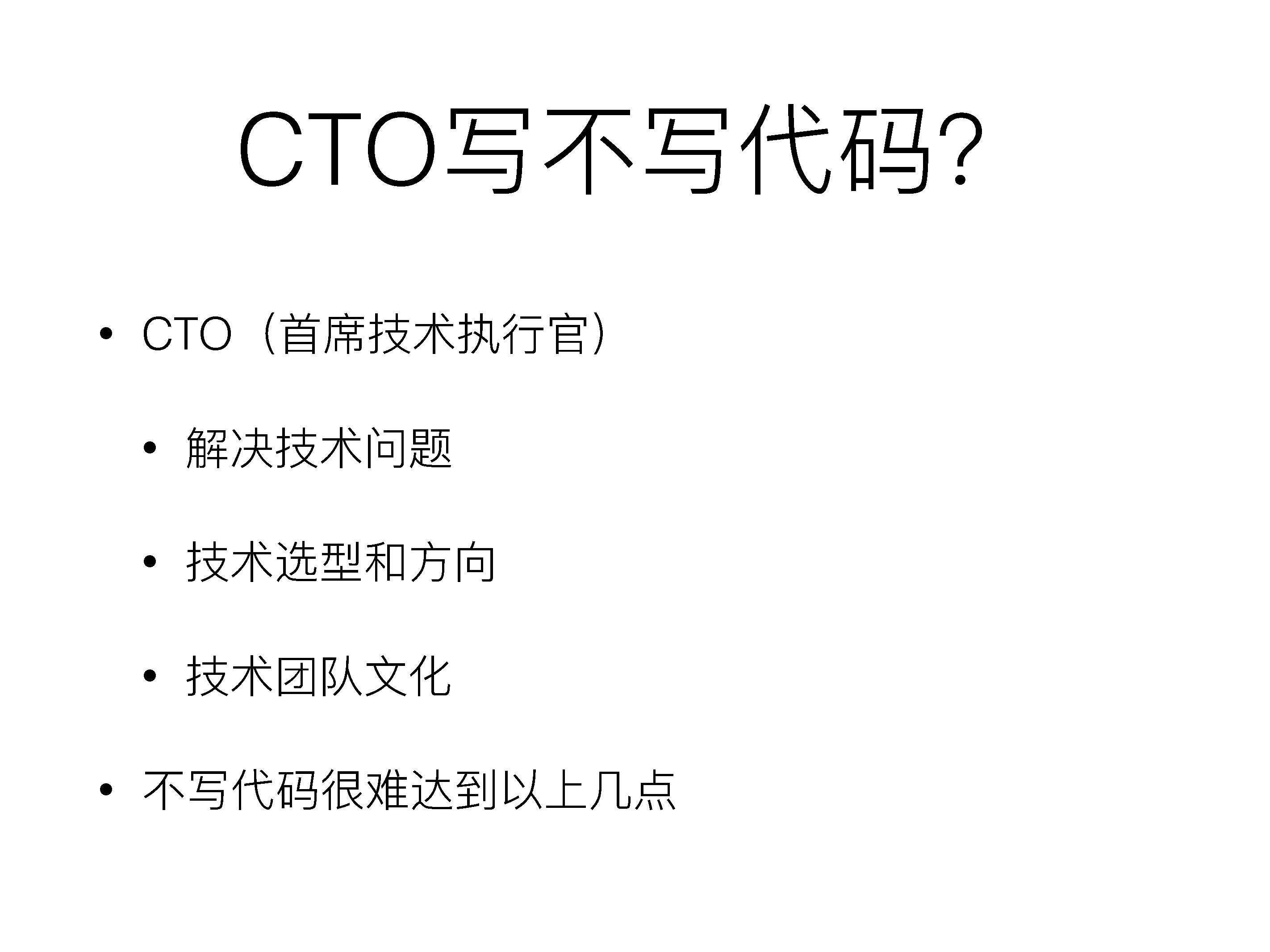 第一个就是CTO写不写代码。回答之前,我们想一下,CTO是做什么的?