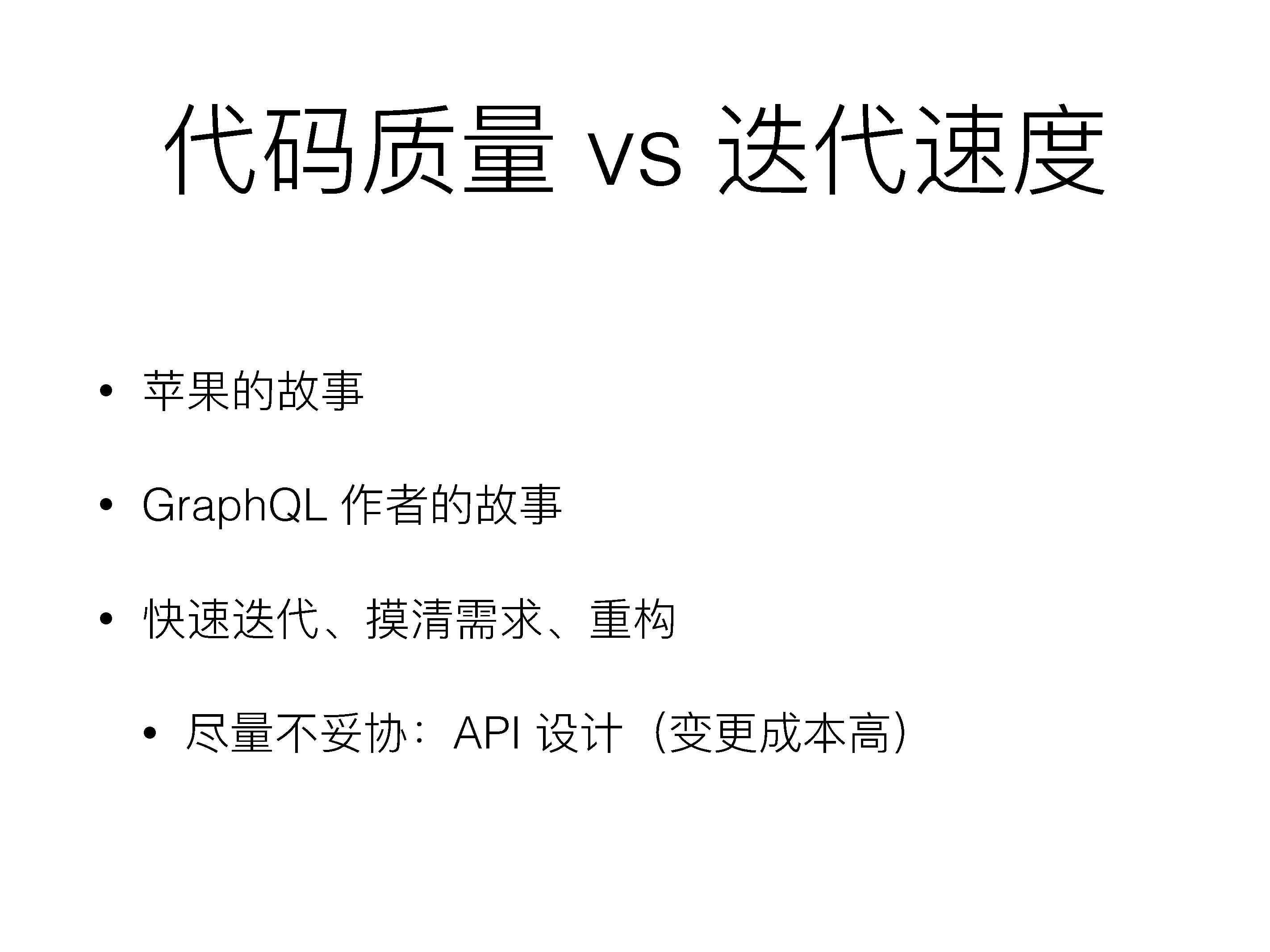 另外一个是我跟GraphQL的作者聊天的故事。他想解决API在移动端的适用问题,我在一次会议上跟他聊天,我说很多时候写完代码都有一种想要重写的冲动,因为我觉得有太多东西可以写得更好。他说他也有这样的时候,第一次写代码的时候,你对整个业务是不了解的,写完之后回去再写,你肯定会写的更好。这是他给我讲的。