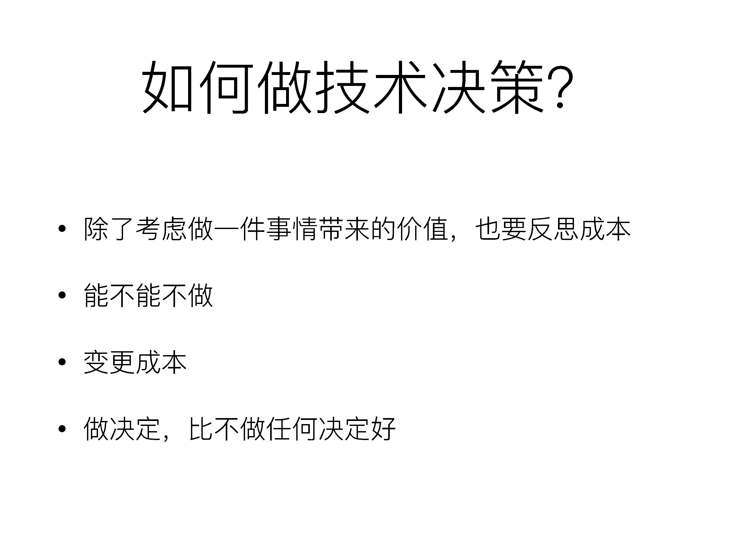 另外,当一个技术决策摆在我面前,我的第一个反应是能不能不做这件事情。如果不写这个代码就能实现这个功能,那我就不写。不做任何工作就能带来,这是最好的。我也会去考虑变更成本的概念。很多时候,可能你真的不确定选A或者选B,因为你没有足够的信息,也没有足够的信心。这时候,哪一个能够让我未来以更少的成本把这个决定推翻、哪一个有更小的变更成本,我就会做那个事情。在没有完整信息的时候,我会选择一个用更低成本能把它推翻的决策——当然前面说过了,我会更有限考虑能不能不做这个决策。