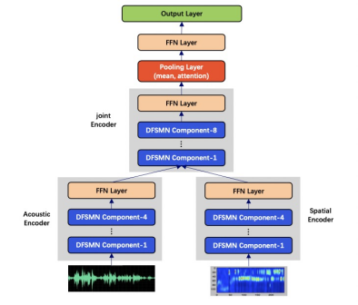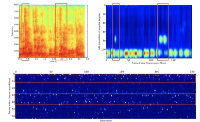 四 前端信号处理技术 1 联合声学特征和空间特征的会议场景混叠语音检测技术 Investigation of Spatial-Acoustic Features for Overlapping Speech Detection in Multiparty Meetings 多人会议场景,存在一个普遍的现象是多人同时说话造成的混叠语音。这种混叠语音的存在对于后续语音增强,语音识别等任务都造成了很大的挑战。本研究我们探索如何有效的检测出多人会议的音频信号中的混叠语音。不同于过往的只利用单通道的音频信号进行混叠语音检测,我们的研究探索了实际录制的8通道语音信号利用信号处理提供的声源空间信息和音频声学信息来联合进行建模进行混叠语音检测。特别的,我们提出了two-stream DFSMN来有效联合建模两种特征,以及提出了一种基于attention的pooling技术来实现句子级的建模。我们在真实录制的会议数据集上进行了实验验证,结果显示联合音频和空间信息的混叠语音检测相比于基线基于音频的检测方法可以获得明显的性能提升。