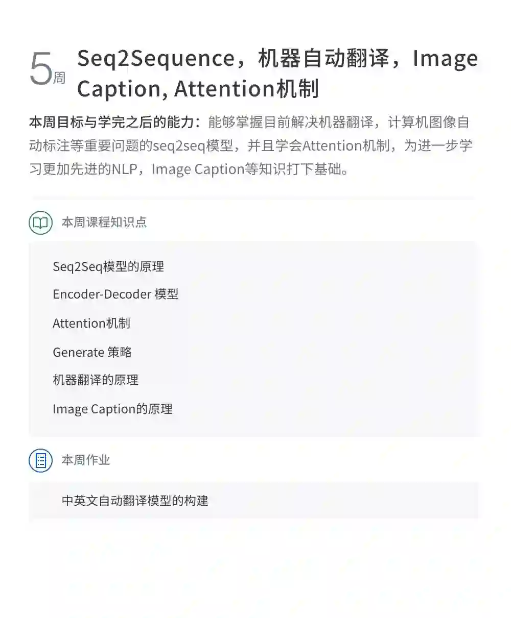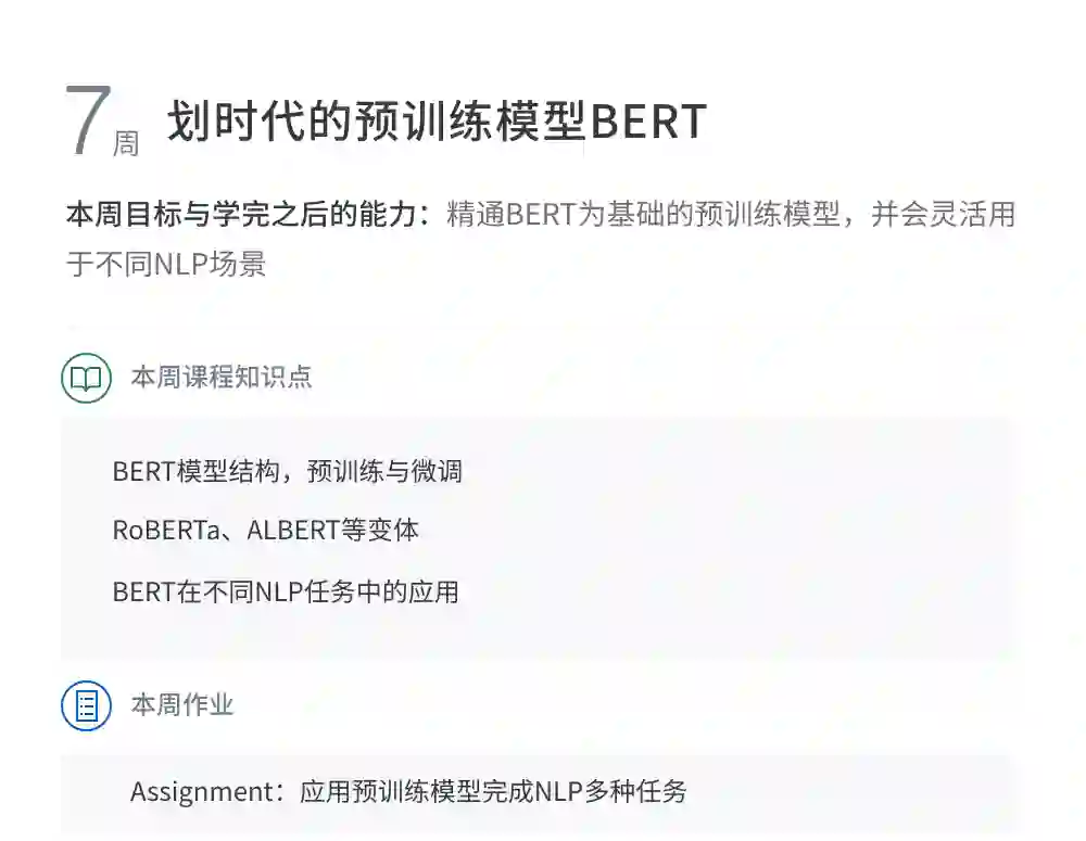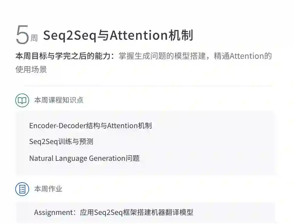 该课程主要集中自然语言处理处理高阶能力的提升。从经典的SEQ2SEQ框架到当今最流行的预训练模型,从多个纬度讲解NLP最实用最前沿的专业知识。旨在培养理解问题透彻、动手能力强、善于解决问题的同学。