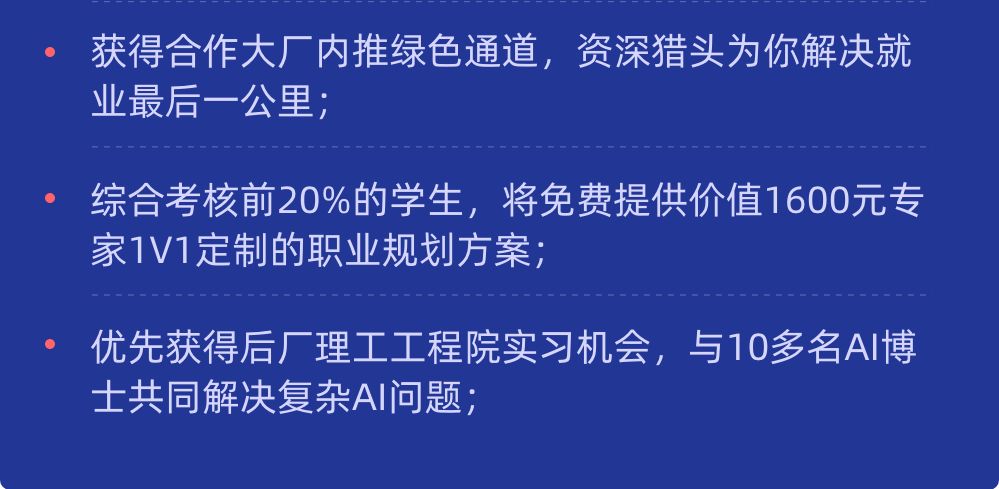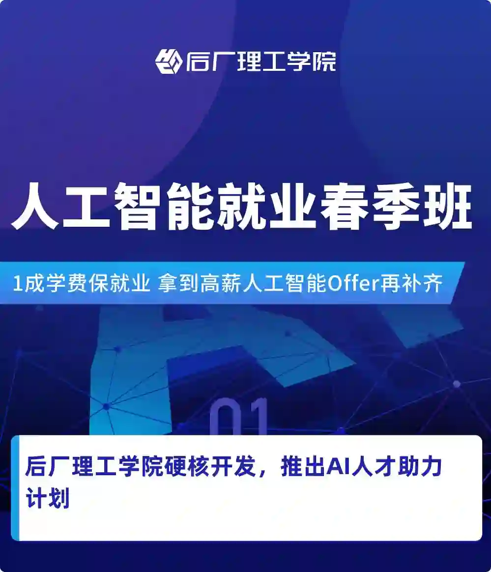 后厂理工学院推出 AI 人才助力计划,做到真正的 “ 无套路,保就业 ”。只需付十分之一的学费,我们就会为你提供体系化的课程内容 + 完备的就业保障服务。