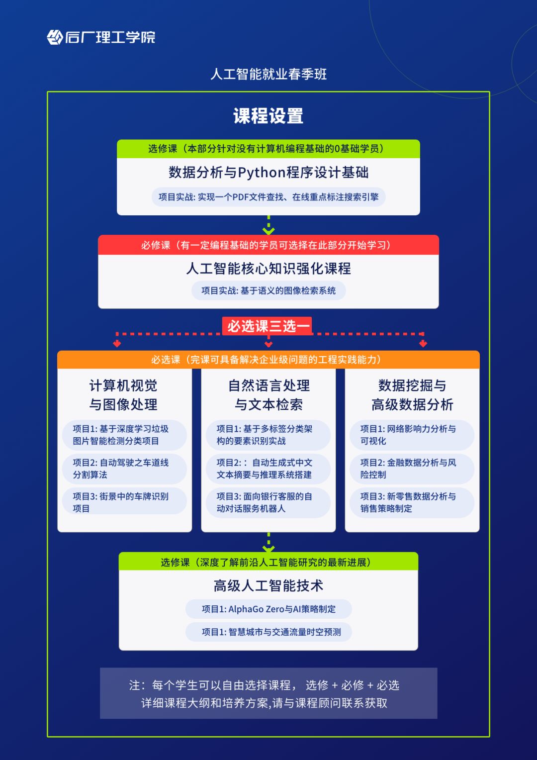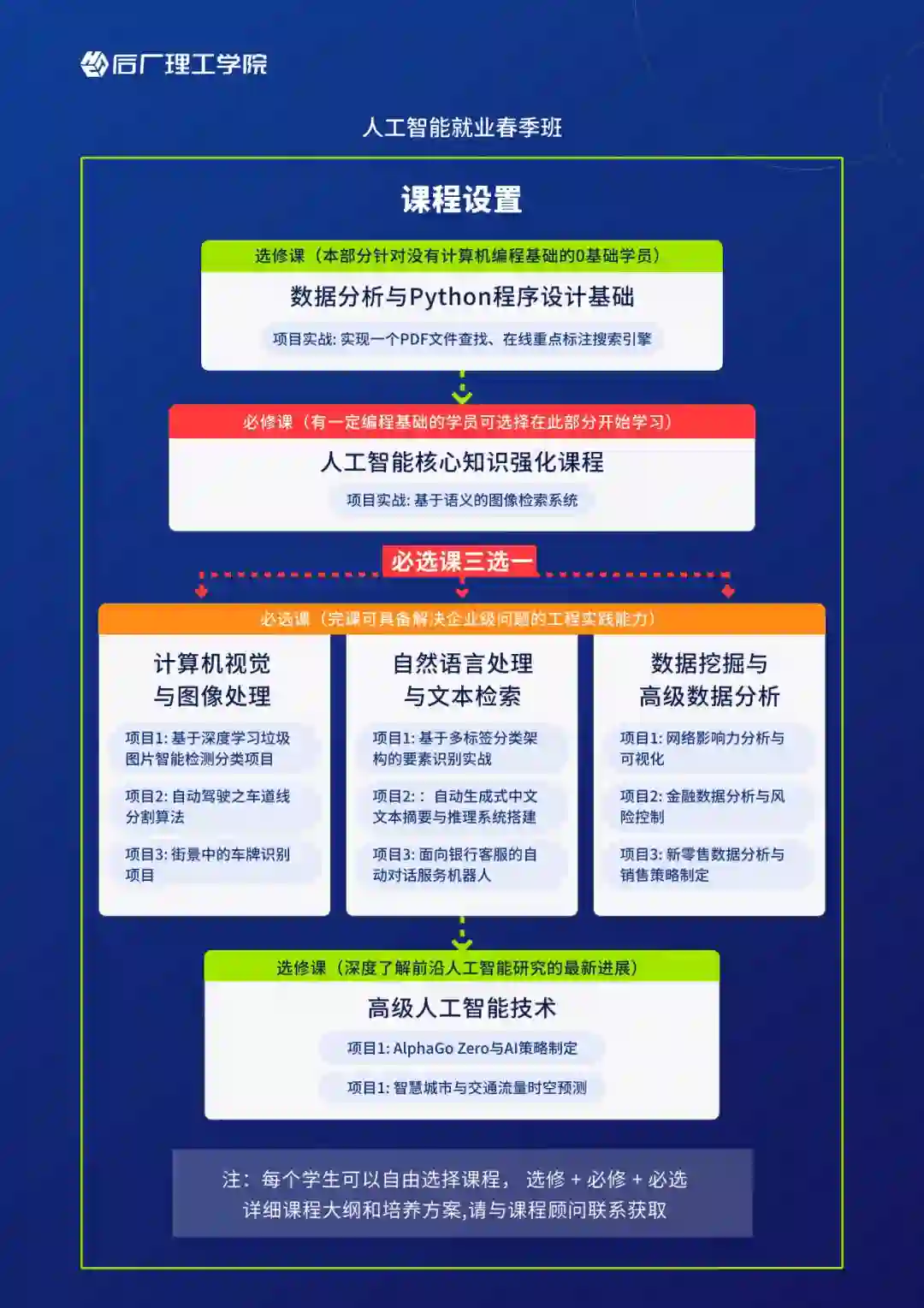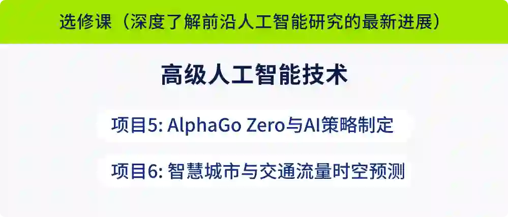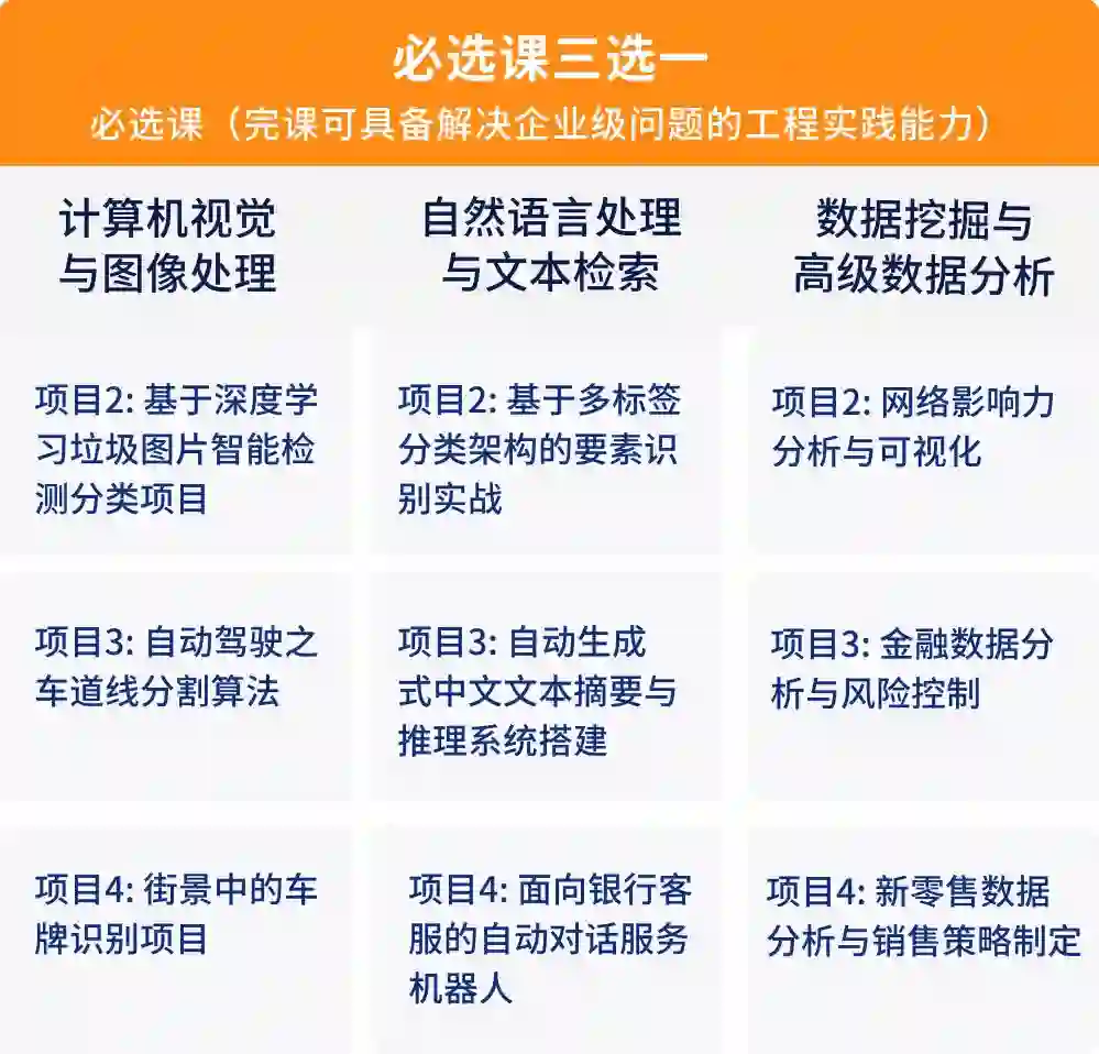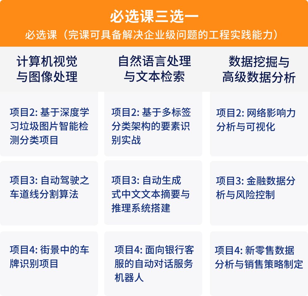 3、课程设计体系化,课程搭配「选修课 + 必修课 + 必选课 +人工智能核心名企项目实训」