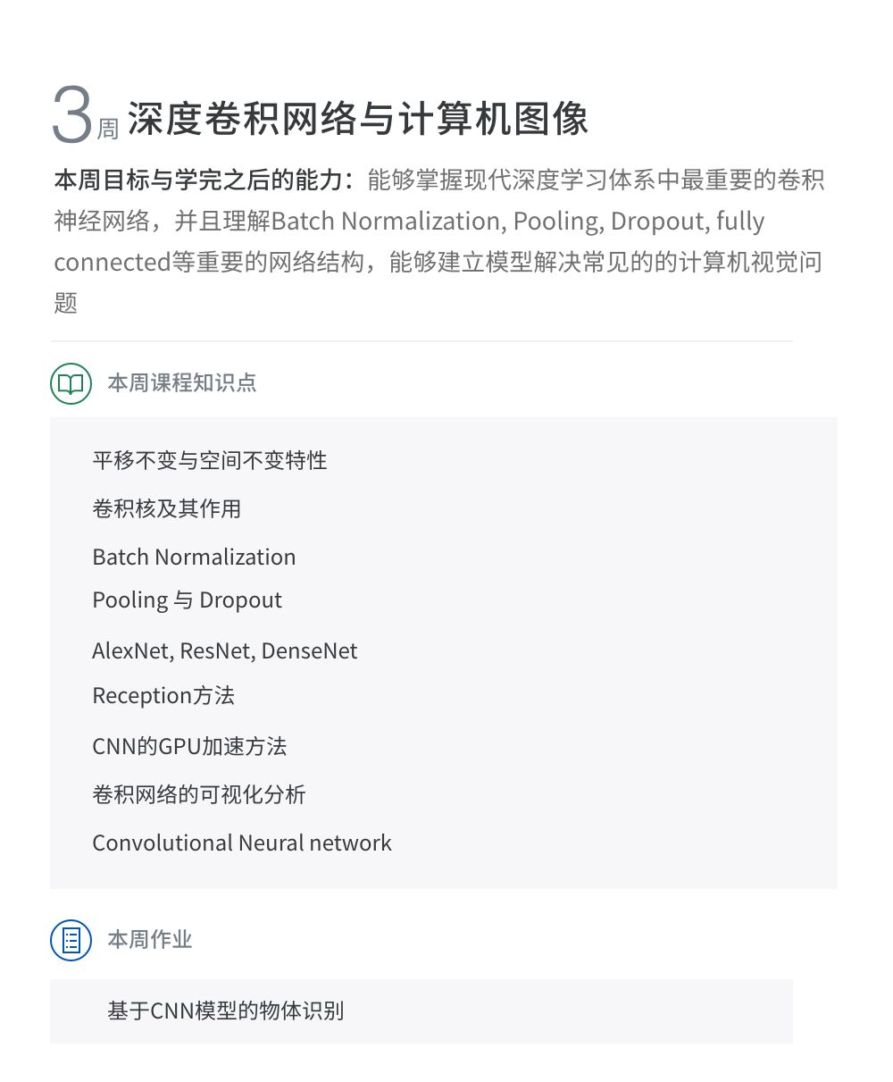 必选课部分包含了人工智能产业应用中最常见也是最主流的3大领域:计算机视觉与图像处理、自然语言处理与文本检索、数据挖掘与高级数据分析。学员可选择1个方向作为主修课程。(限时福利:3月30日之前报名,还可额外选择另1个方向的进行免费旁听。)
