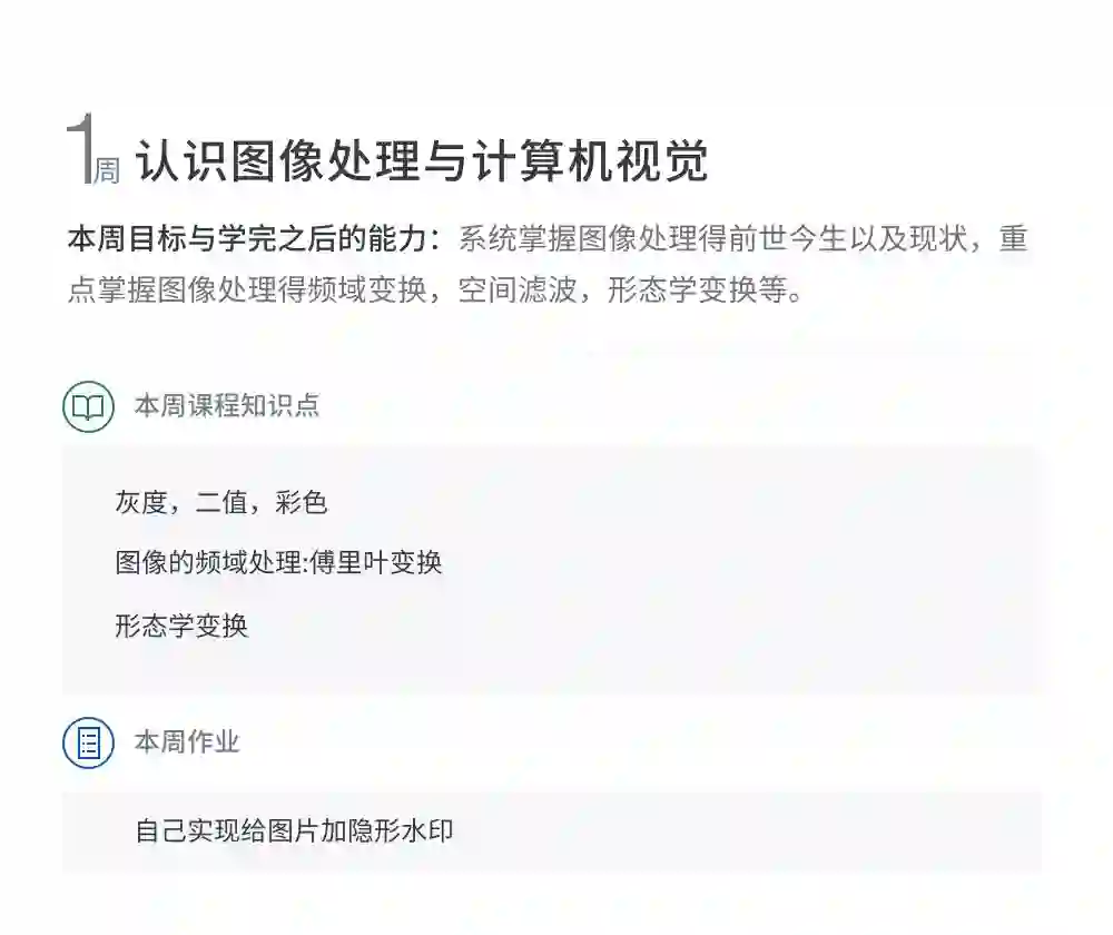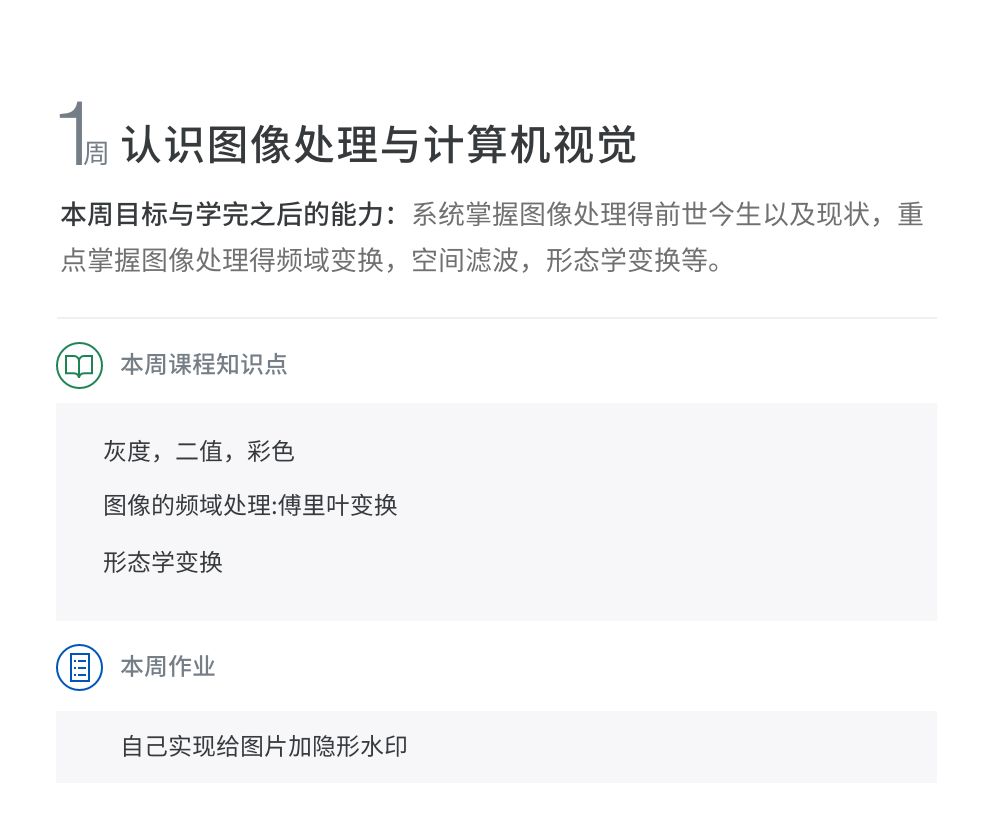 本课程会成系统的讲解图像处理与计算机视觉重的三大基本问题:图像分类问题,图像分割问题,图像目标检测问题。课程讲解深入浅出,内容贴近前沿互联网实际应用,广度和深度并重。从基本的图像处理,如图像空间滤波,亮度变换,图像去噪,形态学处理,频域处理,到最前沿的深度学习模型Resnet深度残差模型,FCN全卷积网络以及yolo3,you only look once,这个又准又高效得目标检测模型。