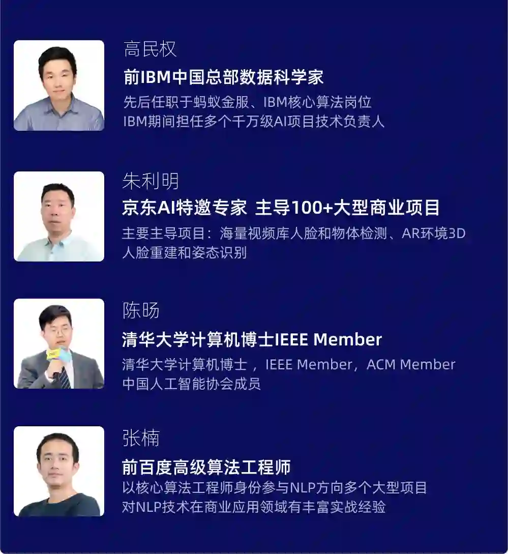 师资整合IBM、百度、阿里巴巴、商汤科技等海内外一线名企导师,助力你转型高精尖AI人才。提供体系化在线课程,满足学员多层次和个性化学习需求。