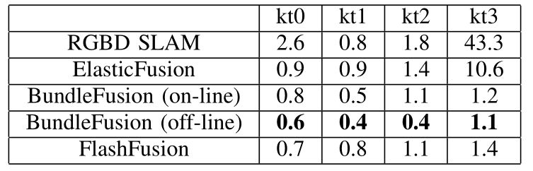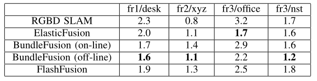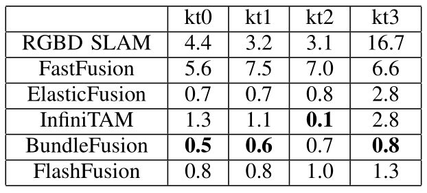 FlashFusion的TSDF和纹理提取的实验结果如下表所示: