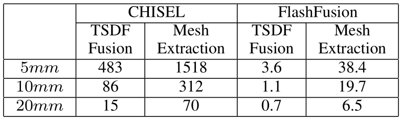 表4. CHISEL和FLASHFUSION之间的效率比较