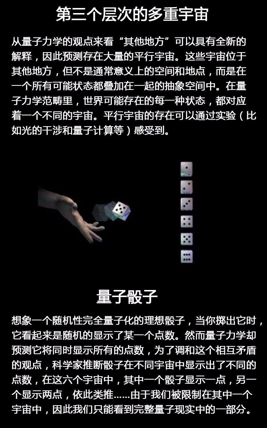 换句话说,第三层次并未在第一层次和第二层次之外增加什么新东西,只是在同一个宇宙中有了更多不可分辨的分身而已:同样的故事线一次次地在其他量子分支上反复上演。因此,只要发现同样宏大但争议较少的多重宇宙(第一和第二层次),围绕埃弗里特理论的火爆争论看来就可以圆满收场了。