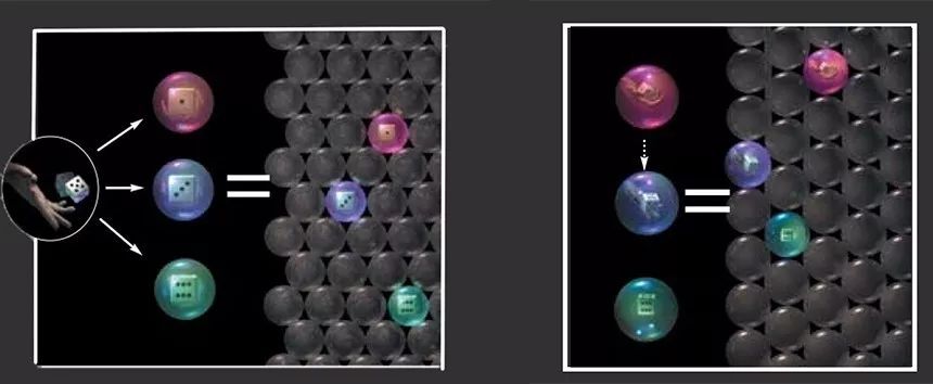 棘手的问题在于如何把这个波函数与我们的观测结果联系起来。许多正常的波函数,导致的却是与直觉相矛盾的情况,例如,一只猫在所谓的叠加态中,可以同时既是死的又是活的。20世纪20年代,物理学家提出了一种方法来解释这类怪事:每当有人观察,波函数便“坍缩”成某个确定的经典结果。这种假设优点在于可以解释观测结果,但它却把一个优美、幺正的理论变得笨拙难看了。