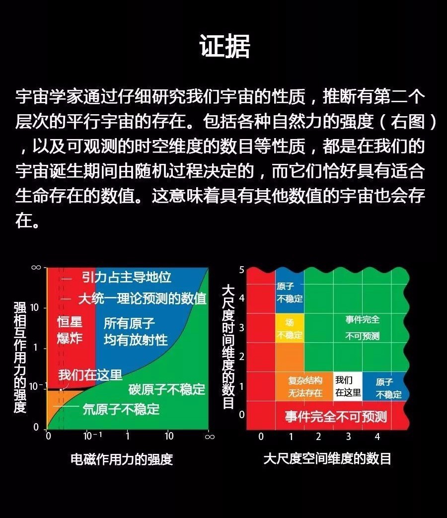 虽然我们不能与其他第二层平行宇宙相互作用,但是宇宙学家还是能够间接推断它们的存在。而它们的存在,也可以解释我们宇宙中部分令人费解的巧合,例如太阳的质量。恒星的质量决定了它的亮度,我们可以计算出,只有当太阳的质量落在1.6~2.4×1030千克这个狭小的范围之内时,才有可能出现我们所知的地球生命。而天文学家测得的太阳质量为2.0×1030千克。