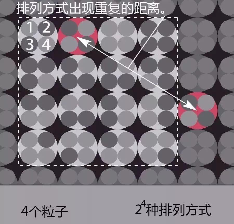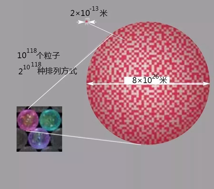我们首先考虑一个简化的模型。想象有一种二维的小宇宙,它的空间仅能容纳4个粒子。这样的宇宙中,物质共有24即16种可能的排列方式。如果这样的宇宙超过16个,那么它的物质排列方式必定会重复出现。在这个例子中,距离另一个最近宇宙的距离,约为每个宇宙直径的4倍左右。