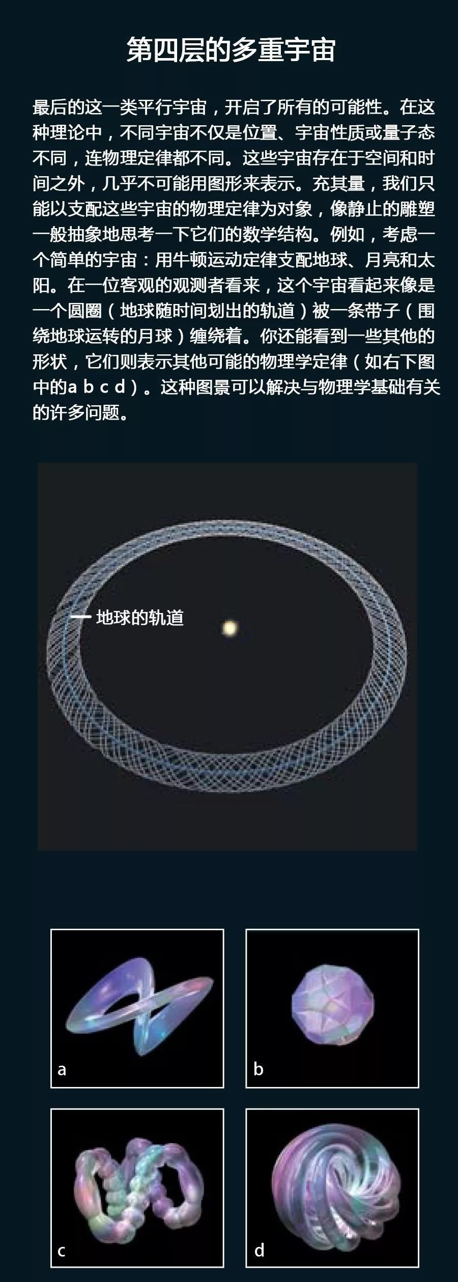 第一层、第二层和第三层次的多重宇宙的初始条件和物理常数可以变化,但支配自然界的基本定律还是相同的。为什么要到此为止呢?为什么不允许物理定律本身也变化呢?如果一个宇宙只服从经典物理学而没有量子效应,那么情况将如何?如果时间是离散的而不是连续的,情况又将如何?实际上,在第四个层次的多重宇宙中,所有这些另类怪胎都是存在的。