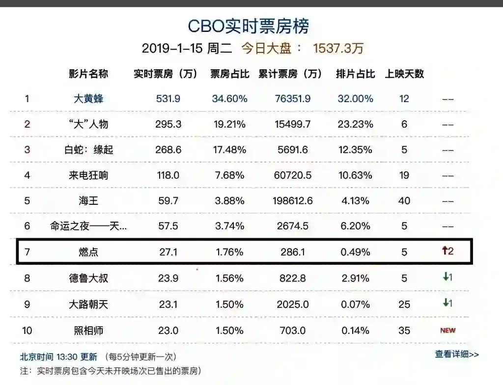 根据 CBO 实时票房榜数据,国内首部创业纪实电影《燃点》截止 1 月 15 日 13时累计票房仅为 286.1 万元,比起同期上映的三部电影的累计票房:5691.6 万(《白蛇:缘起》)、2674.5 万(《命运之夜—天之杯:恶兆之花》)、822.8 万(《德鲁大叔》),该电影在国内电影市场上并未“燃”起来。