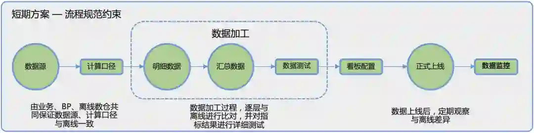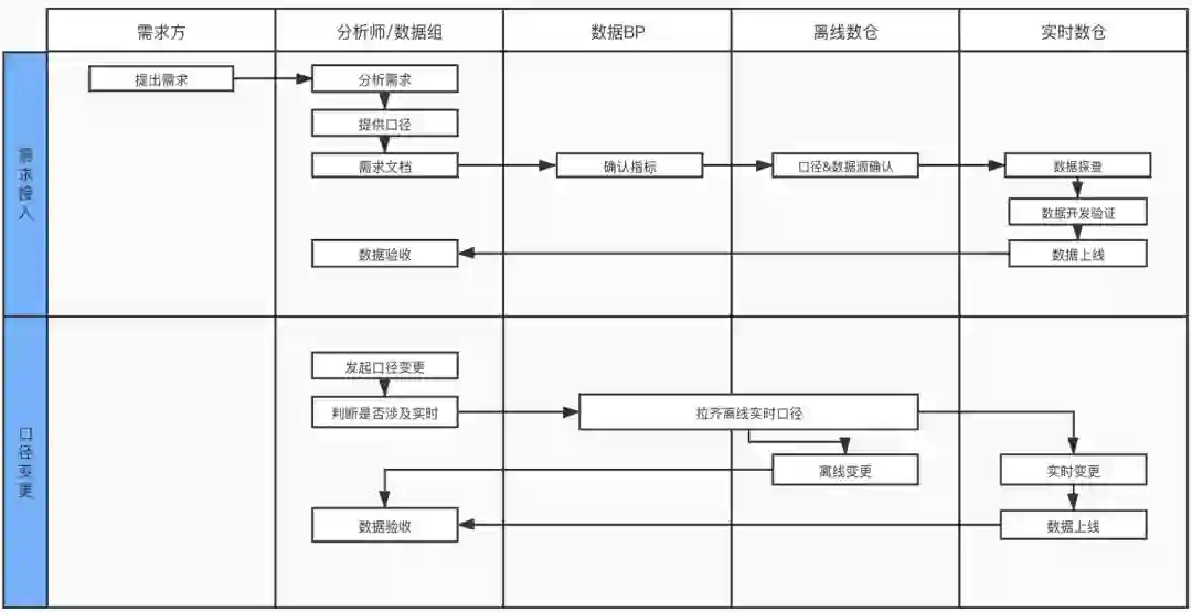 口径变更--业务方发起:业务方发起口径变更,判断是否涉及到实时指标,数仓BP对离线和实时口径进行拉齐,向离线数仓团队和实时数仓团队提供更口口径和数据源表,实时数仓团队先上测试看板,验收通过后切换到正式看板