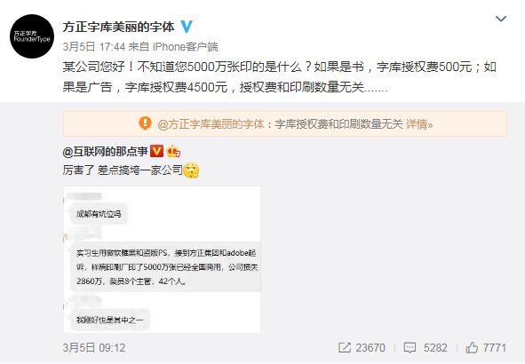 针对这些言论,方正官方微博@方正字库美丽的字体 回应称,“某公司您好!不知道您5000万张印的是什么?如果是书,字库授权费500元;如果是广告,字库授权费4500元,授权费和印刷数量无关”。