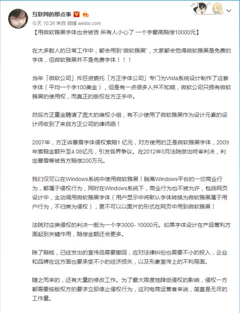 昨天一张截图将“微软雅黑”推上了微博话题热搜榜,一下子方正、微软雅黑、版权等成为网友们热议的话题。