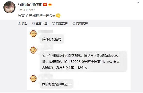 事情开端于知名互联网博主@互联网的那点事 在微博发出截图爆料,有自称某公司的员工称,“实习生用微软雅黑和盗版PS,接到方正集团和adobe起诉,样稿印刷厂印了5000万张已经全国商用,公司损失2860万,裁员8个主管,42个人。自己刚好也是其中之一。”
