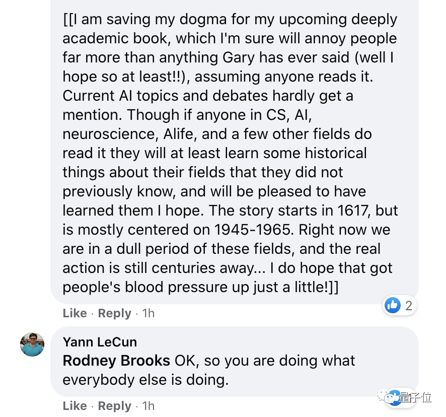 在Facebook对话下回复LeCun的,是Robust.AI的CTO,MIT松下机器人研究院的教授Rodney Brooks。