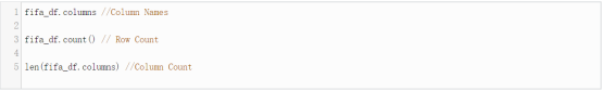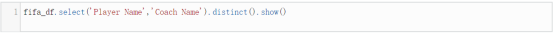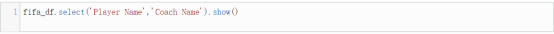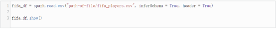 让我们从一个CSV文件中加载数据。这里我们会用到spark.read.csv方法来将数据加载到一个DataFrame对象(fifa_df)中。代码如下: