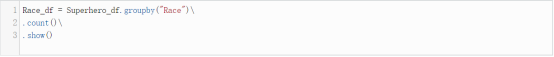 GroupBy 被用于基于指定列的数据框的分组。这里,我们将要基于Race列对数据框进行分组,然后计算各分组的行数(使用count方法),如此我们可以找出某个特定种族的记录数。