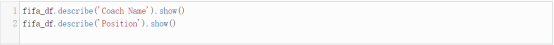 如果我们要看一下数据框中某指定列的概要信息,我们会用describe方法。这个方法会提供我们指定列的统计概要信息,如果没有指定列名,它会提供这个数据框对象的统计信息。