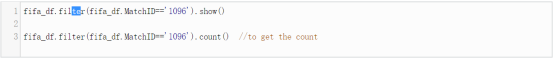 为了过滤数据,根据指定的条件,我们使用filter命令。 这里我们的条件是Match ID等于1096,同时我们还要计算有多少记录或行被筛选出来。