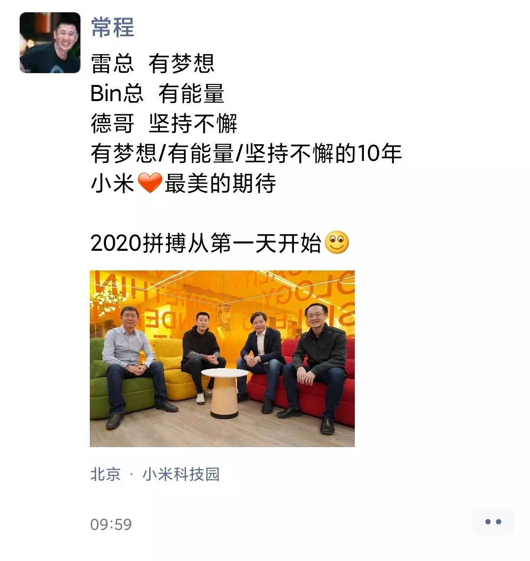 “雷总有梦想,Bin总有能量,德哥坚持不懈,有梦想/有能量/坚持不懈的10年,小米❤最美的期待”。