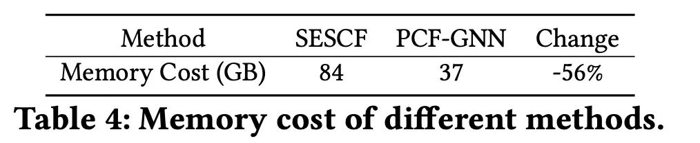 我们对比了采用交叉统计特征和PCF-GNN在模型存储上的开销,见表4. 可以看到,通过PCF-GNN可以节省一半多的存储开销。此外,在实际应用中,我们还可以采用hash embedding的技术来对PCF-GNN的embedding开销进行进一步的缩减。