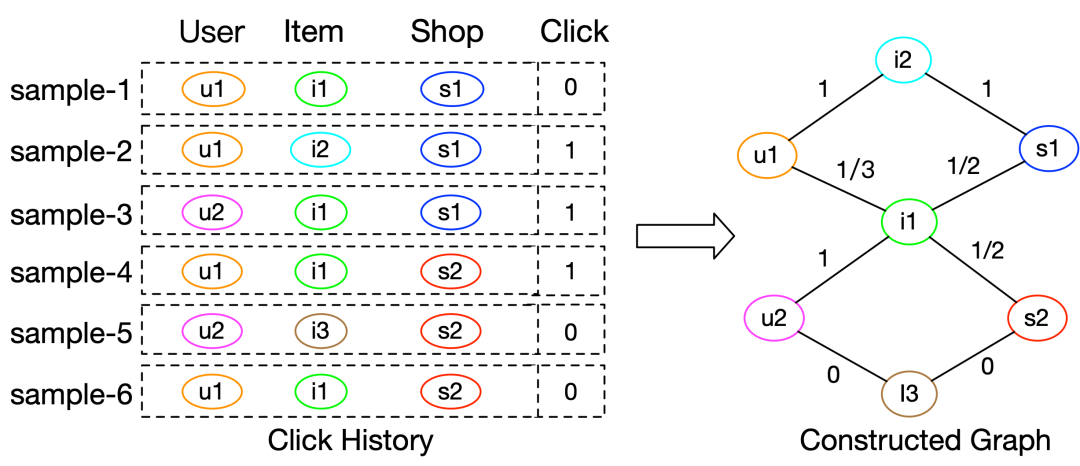 如图1所示,给定用户的历史点击信息,我们以交叉特征<User,Item>和<Item,Shop>为例来构建图网络。图网络中,节点表示特征,边表示历史交互,边属性表示交叉统计值。具体而言,边 的边属性 可以通过一下公式来计算:
