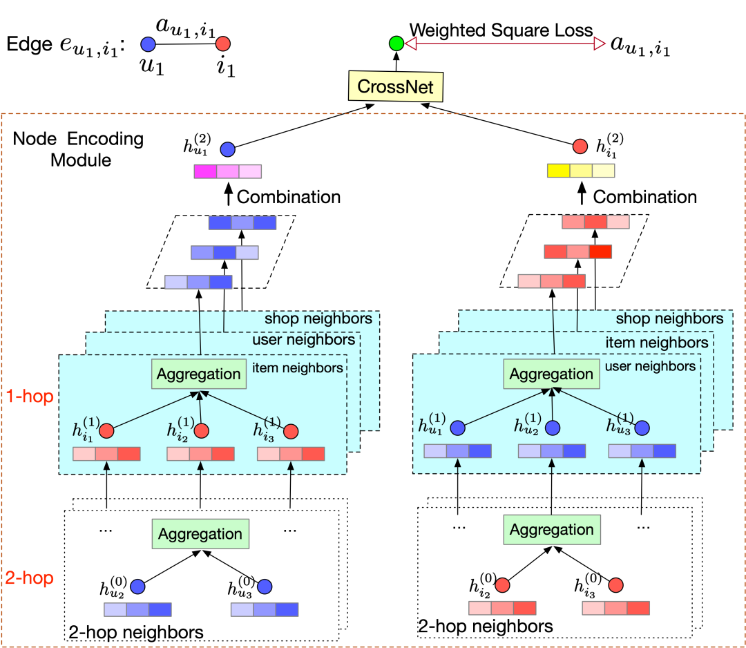 其中 是边 的属性预估值。在CrossNet的具体实现上,可以是一个简单的点击操作也可以是一层神经网络。