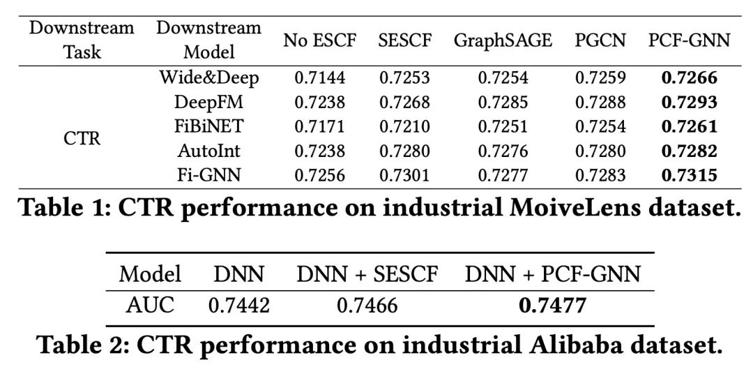 这里我们主要将预训练得到的PCF-GNN应用于CTR任务(其他相关任务也可以应用)。如图3所示,右边部分是一个标准的Embedding&MLP结构的CTR模型。我们可以将PCF-GNN预估值 和CTR模型的Embedding结果拼接起来一起送到MLP中去。这样以来,通过 ,可以让CTR模型感知显式的交叉语义信息。
