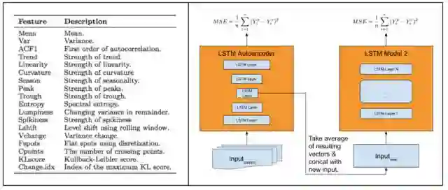 我们的模型由手动派生的时间序列特征(左)和我们提出的具有自动特征提取模型(右)的LSTM架构组成