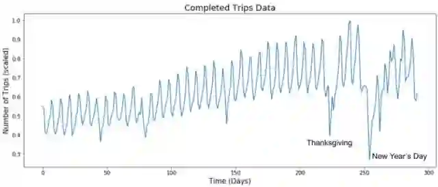 在城市中随时间推移而变化的规模性旅行次数是用于训练我们模型的历史数据储存的一部分。 请注意除夕夜期间数据的一个下跌,然后急剧上涨,表示人们在除夕夜期间乘用Uber回家。
