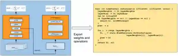 一旦计算了神经网络的权重,它们就可以以任何编程语言形式进行导出和执行。我们当前的途径是首先使用Tensorflow和Keras进行离线训练,然后将生成的权重导出为本地Go代码,如下所示: