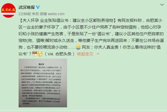2、@小小编辑 :近 日,一名将做爸爸的男子在微博上掀起了一场波澜。事情的缘由是这样的,这名男子的媳妇刚确认怀孕,他在小区张贴倡议书,要求住户们都把宠物猫和狗永久的送 走,实在不方便,也请在他媳妇生完孩子后再接回来。并要求小区的住户们不要遛狗,更不要投喂流浪动物,并说“请为了大环境做出一点力所能及的贡献”。#乱弹大吐槽#