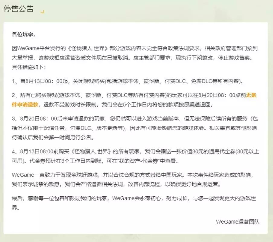 今天上午,腾讯游戏平台(WeGame,即原TGP),在《怪物猎人世界》的游戏页面,发布停售公告称,“因 WeGame 平台发行的《怪物猎人世界》部分游戏内容未完全符合政策法规要求,相关政府管理部门接到大量举报,该游戏相应运营资质文件现在已被取消。应主管部门要求,现执行下架整改,停止游戏售卖。”