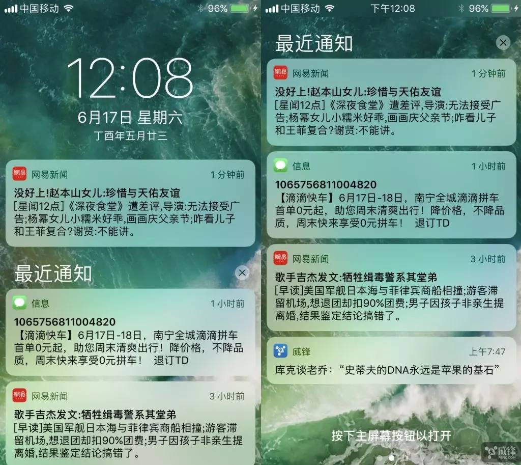 锁屏整体与 iOS 10 还是差不多,但是 iOS 11 与通知中心更好的融合了。当你像平时那样在任意一处下滑打开通知中心的时候,按照平常你可以看到所有通知,但是现在变得干净了,因为这一界面直接回到了锁屏界面,只能看到最近的通知,想看到更早一点的通知还要再做一步上滑的动作。而关闭通知中心,也不是上滑关闭了,因为是锁屏界面,需要按下 HOEM 键解锁。