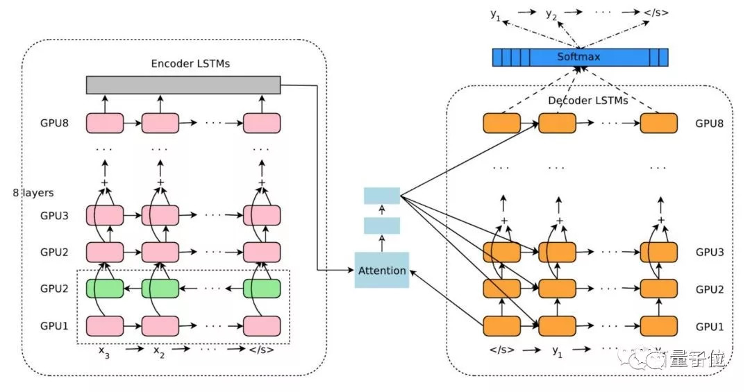 在 Text to text NLG 领域,令人瞩目的进展当属 GNMT (Google Neural Machine Translation)。它基于带 Attention 机制的 Encoder(8层LSTM)- Decoder(8层LSTM) 框架(图4),通过引入残差连接(Residual Connection),并基于 Google 打造的 TPU (Tensor Processing Unit)进行并行化处理,高效地进行 GNMT 模型的训练和预测。